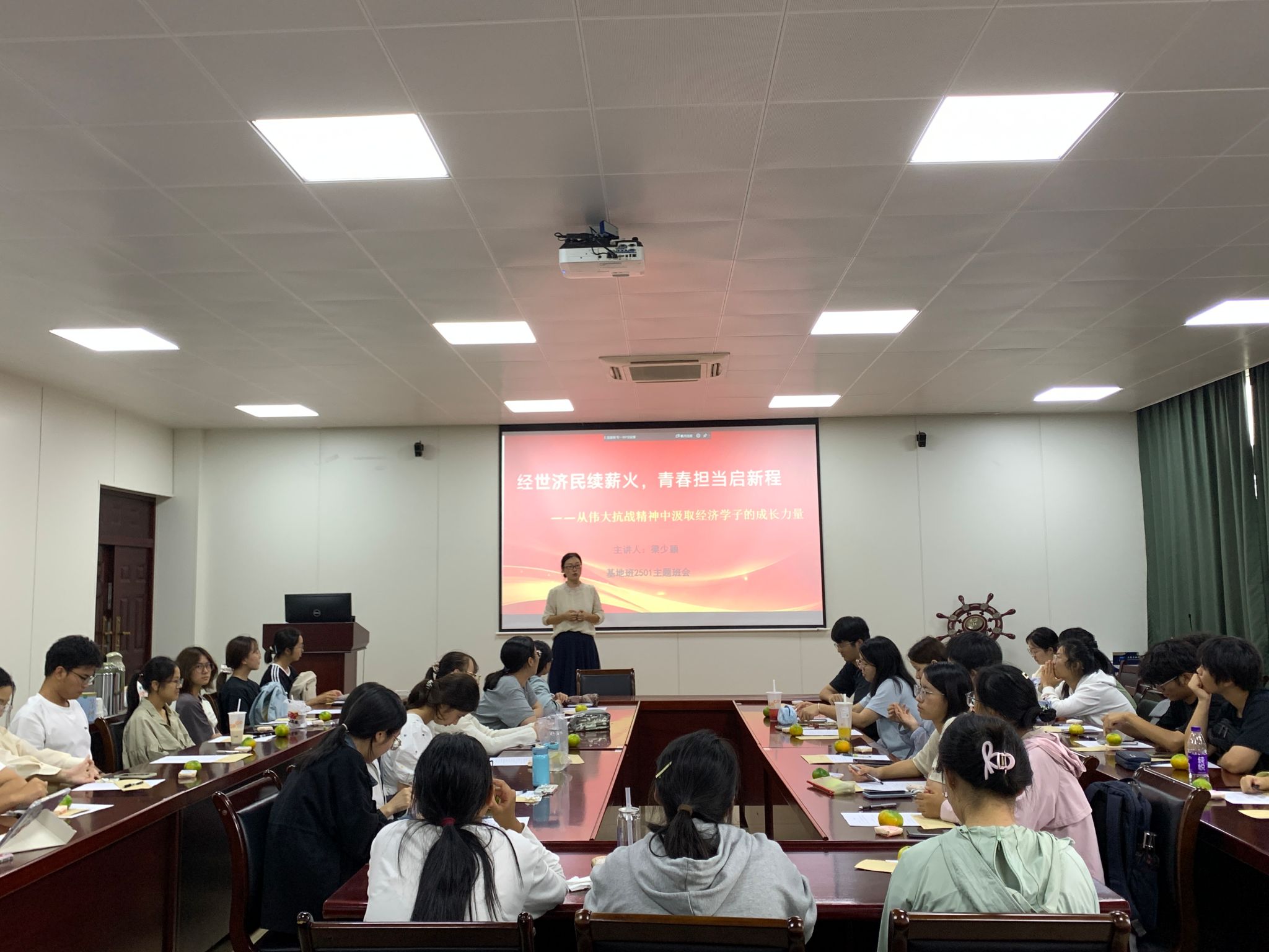 其中,基地班2501班在辅导员梁老师主持下,于9月28日成功举办了“经世济民续薪火,青春担当启新程——从伟大抗战精神中汲取经济学子的成长力量”主题班会,为全院新生班会活动树立了典范。本次特色班会创新设计“光影记忆”“薪火相传的对话”“启航新程的行动”三大递进篇章,将理想信念教育、专业认知教育与生涯规划指导有机融合。